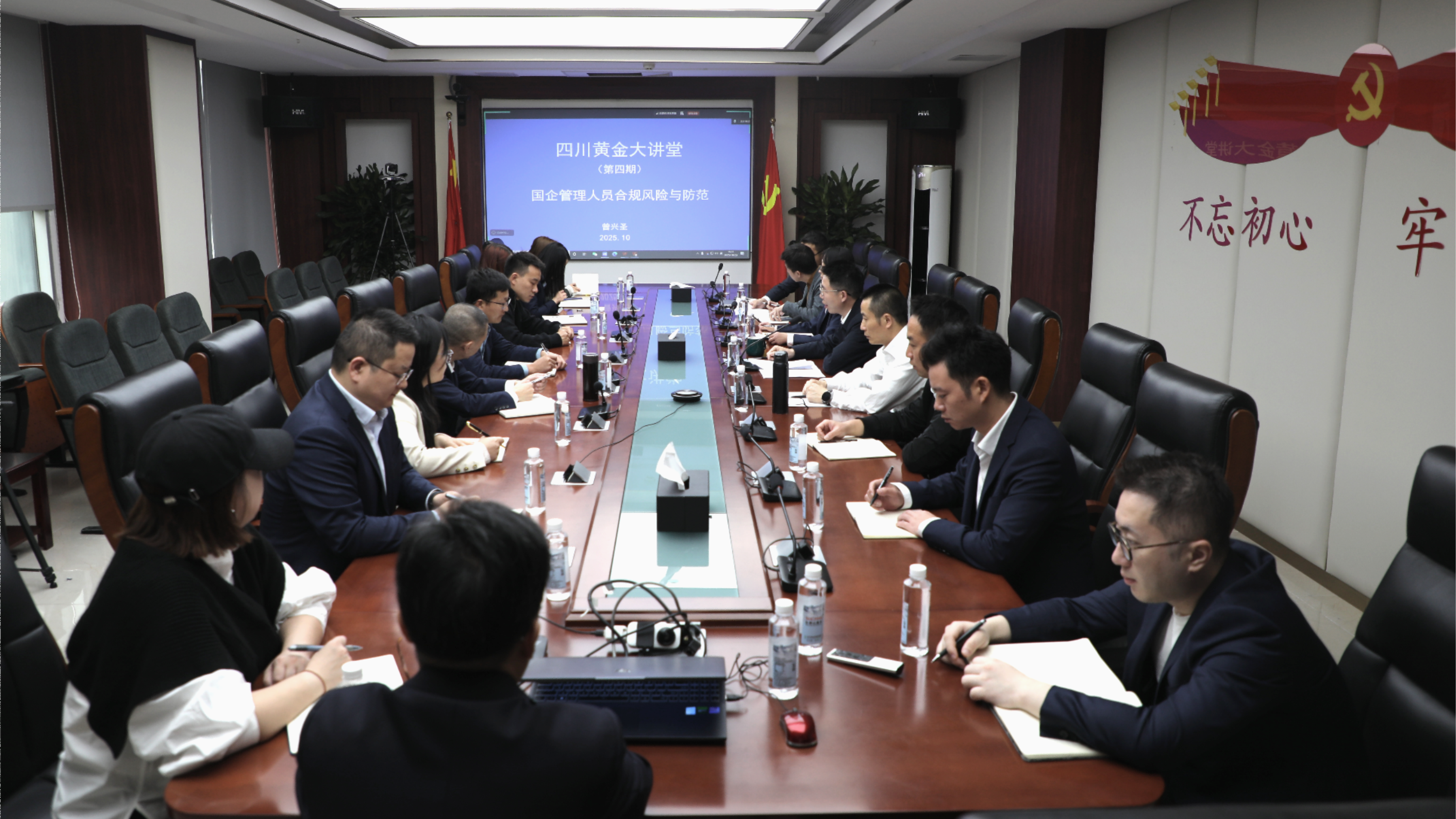 法律合规专家曾兴圣作《国企管理人员合规风险与防范》专题授课,全面讲解了公司管理人员在履职过程中可能面临的多种合规风险,提供了防范风险的解决路径。培训要求,公司全体人员要强化职责意识,提升履职能力;强化风险意识,提升防范能力;强化合规意识,提升管理能力。 本次大讲堂采用线上线下相结合形式开展,公司在家领导班子成员、各部门负责人在主会场参学,其余人员在分会场视频参学。