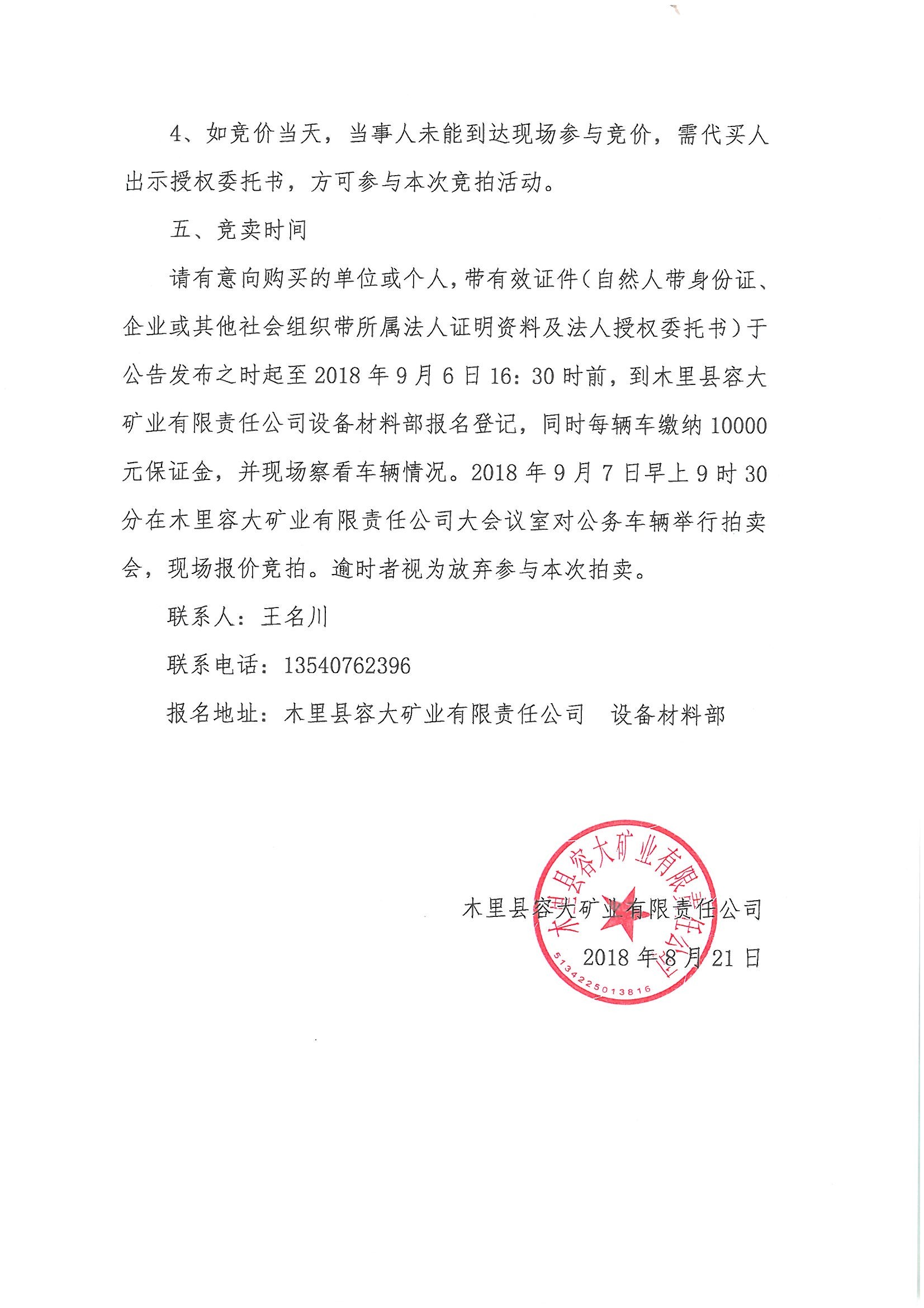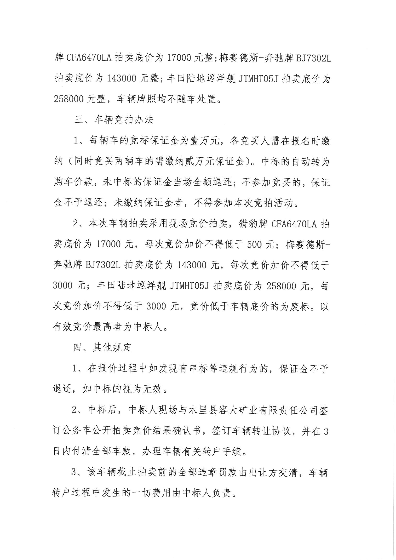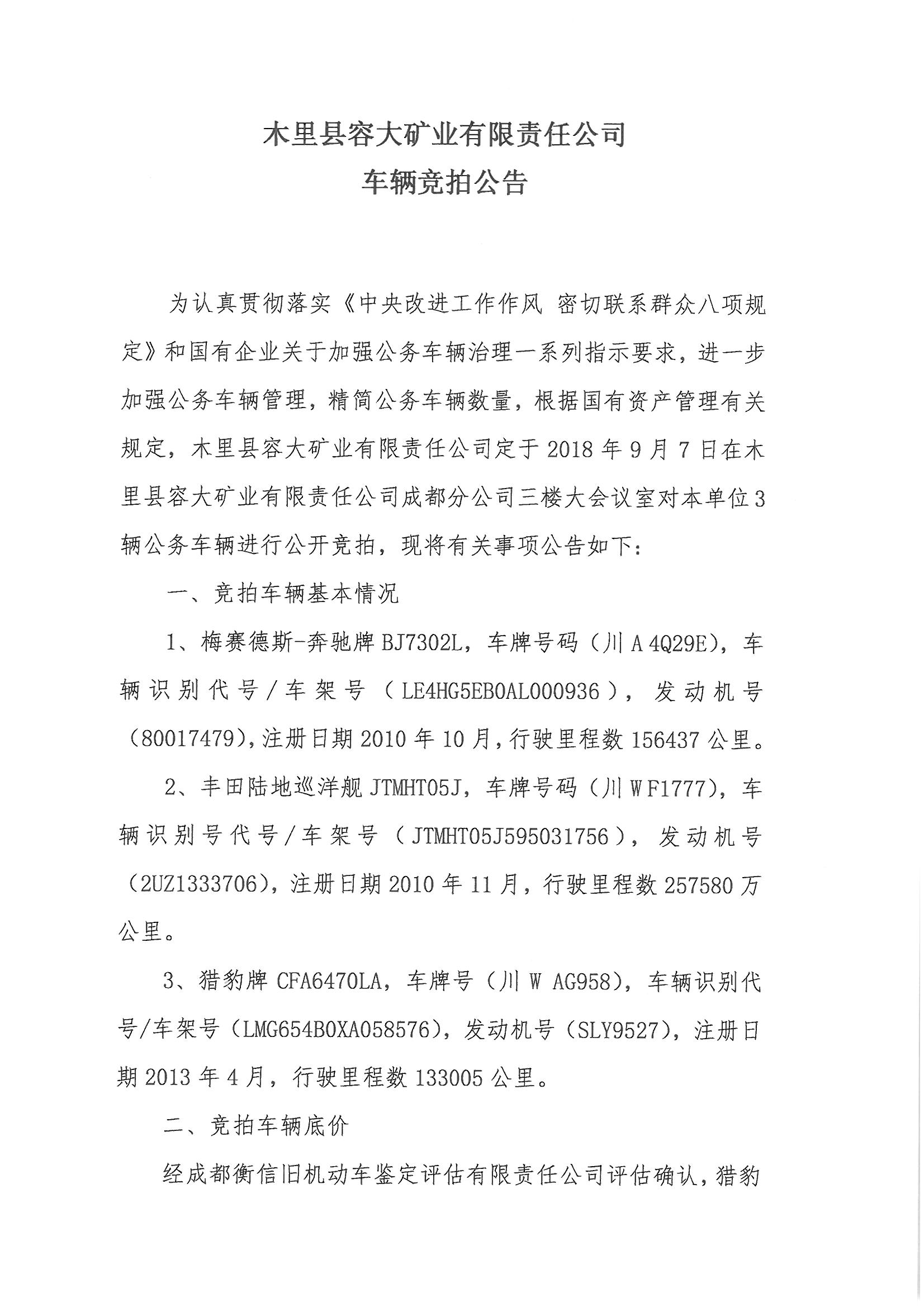 木里容大矿业关于以公开竞拍方式处置车辆的公告